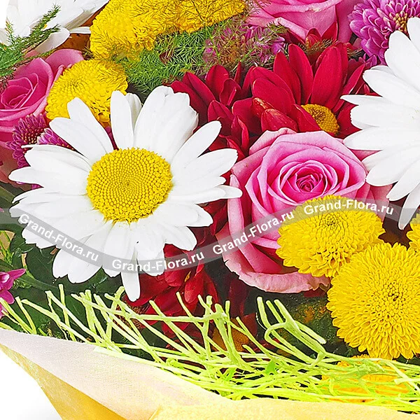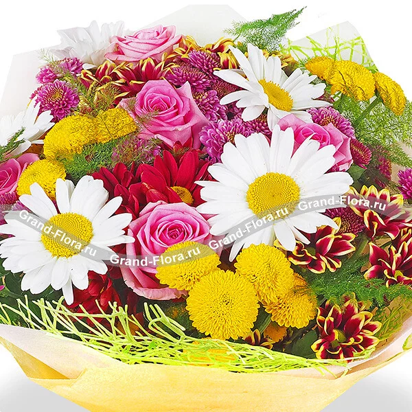 Прикосновение страсти - букет из ромашек,роз и хризантем